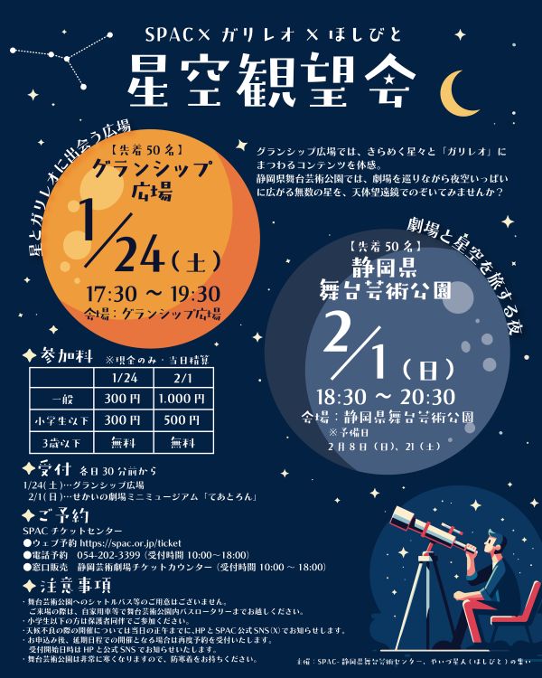 グランシップ広場では、きらめく星々と「ガリレオ」にまつわるコンテンツを体感し、静岡県舞台芸術公園では、劇場を巡りながら夜空いっぱいに広がる星々を観望します。演劇と宇宙が出会う、特別な夜をお楽しみください!