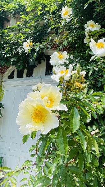 浜名湖ガーデンパーク「モネの庭」。バラは「マーメイド」というモネが愛した一重咲きの遅咲き品種のバラ。私も大好きなバラですが、樹勢が強く、かぎ状の鋭い棘と相まって、狭い庭で育てるのは躊躇しています…