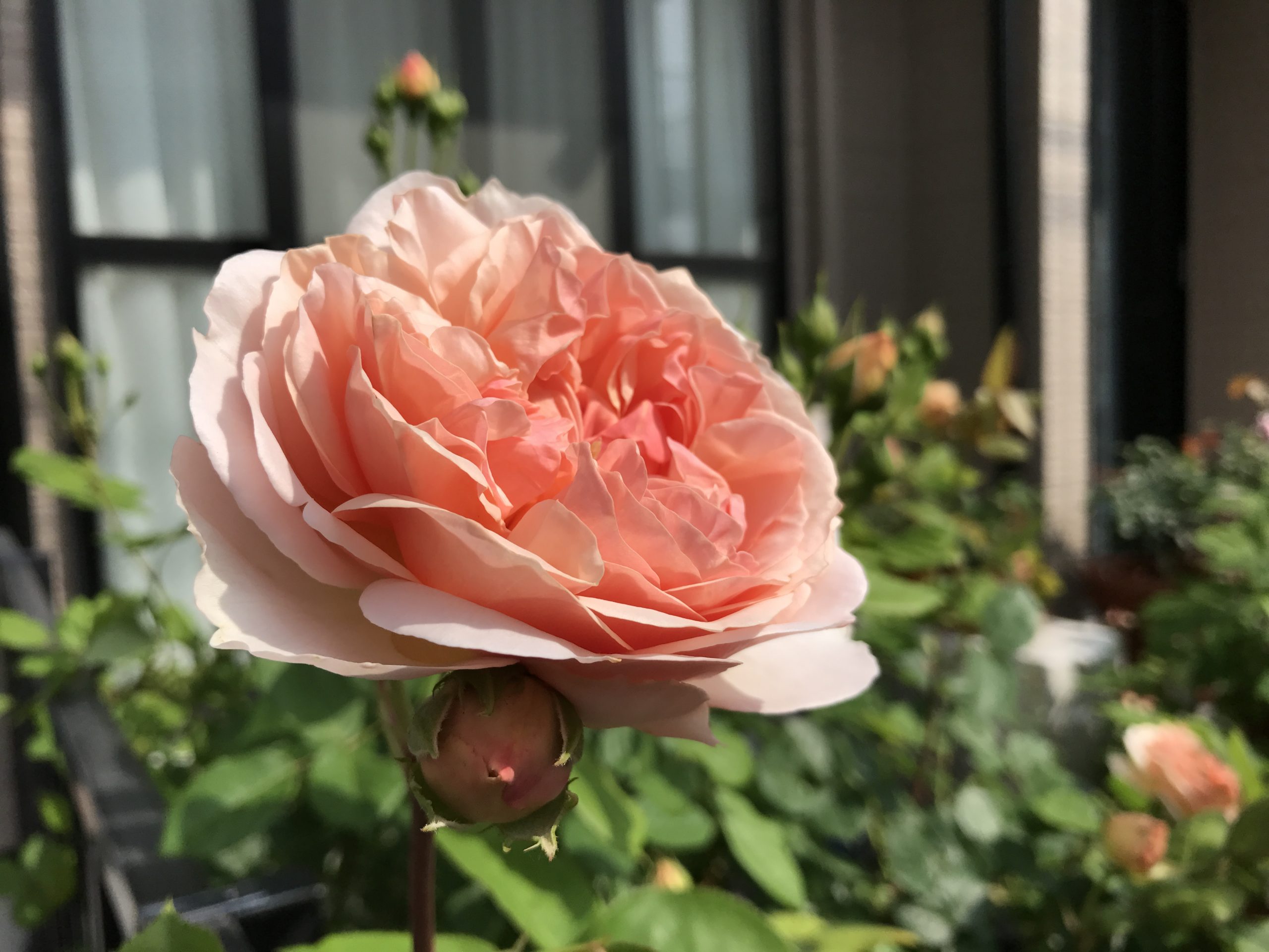 我が家のバラ。イングリッシュ・ローズの「エブリン」という品種で、香水会社の名を冠した強香のバラです