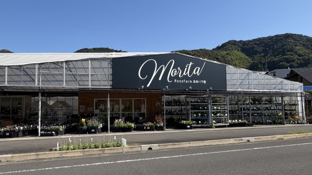 森田バラ園さまは、静岡市葵区の県立こども病院にほど近い場所にあるバラ園。大きな看板と店頭に並ぶ様々な花苗やガーデングッズが目を引きます。森田バラ園さまでは、バラの品種や特性に合わせて土耕栽培と水耕栽培を組み合わせ、徹底した温湿度管理のもと、20品種のバラを育てています。