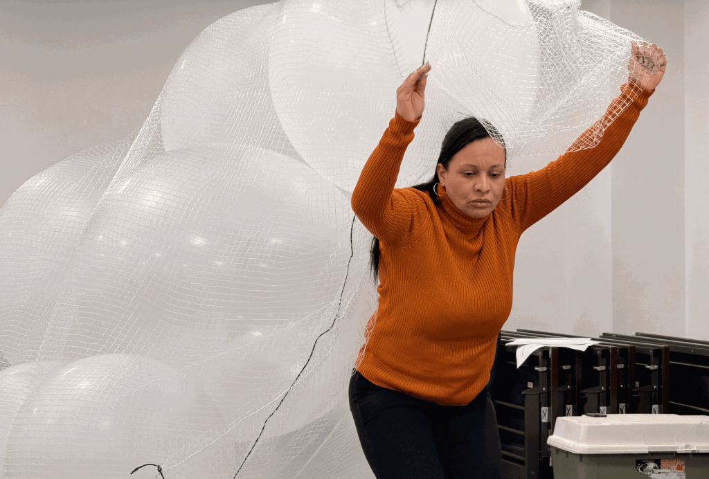こうしたリサーチの体験は、稽古場に持ち帰られ、やがて作品の中に現れていきます。それらは稽古場の中で、出演者たちの身体や声を通して、別のかたちに変わりつつあります。リサーチで得たものがどう舞台に立ち上がるのか、ぜひ客席で確かめてください。稽古場では、さまざまな素材を使った実験も繰り返されています。風船が別のものに見える瞬間、日常の道具が得体の知れない存在に変わる瞬間。何が作品に残り、何が消えていくのかは、まだ誰にも分かりません。