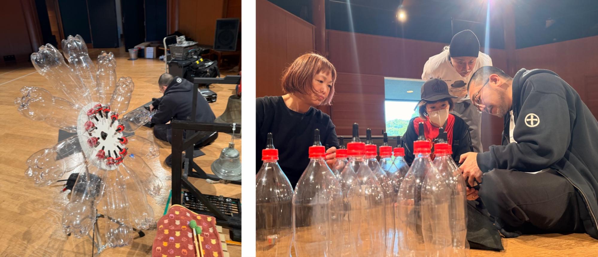 吉見亮さんを中心に、空きペットボトルから楽器を作る稽古場の様子(撮影:張藝逸)