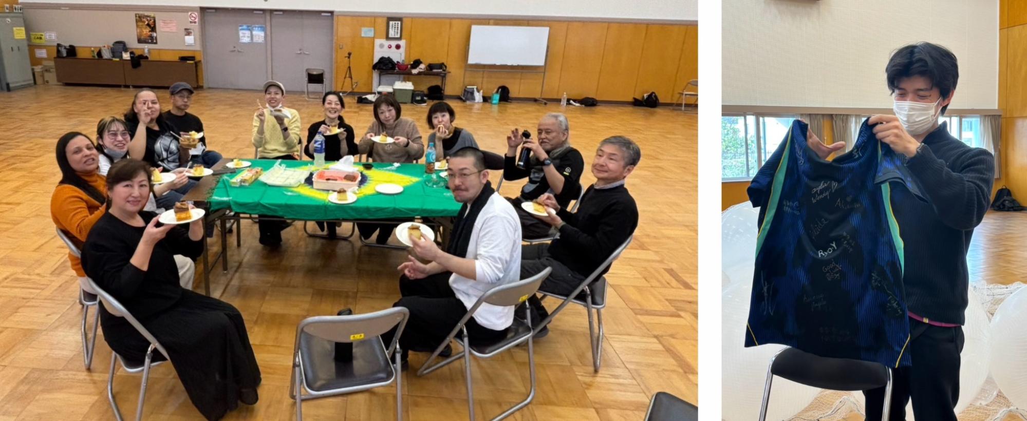 Meanwhile, as we approach the premiere, some are moving on to the next place. Toshiki Sakanaka, who has accompanied this work as producer for over a year, is originally from Hamamatsu. “I’d long hoped SPAC could play a part in building ties with western Shizuoka,” he has said. This work brings together the eel, the signature specialty of Lake Hamana, and one of Japan’s largest Brazilian communities, the two defining features of western Shizuoka. Throughout the process, he kept saying he wanted many people to see it. At the end of fiscal year 2025, Sakanaka left SPAC. When the news spread, Angela baked a caramel cake and brought it to the rehearsal room, and everyone shared it. Ayla prepared a farewell gift inscribed with words and signatures from each of us. Being present as someone leaves is itself one shape of the question of movement and existence.